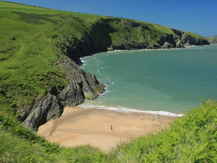 Mwnt is an idyllic spot on the Ceredigion coast, with sweeping views across Cardigan Bay from the summit of the conical hill (Foel y Mwnt) that rises above the sheltered sandy beach. The beach itself is reached by steps alongside a tumbling stream.